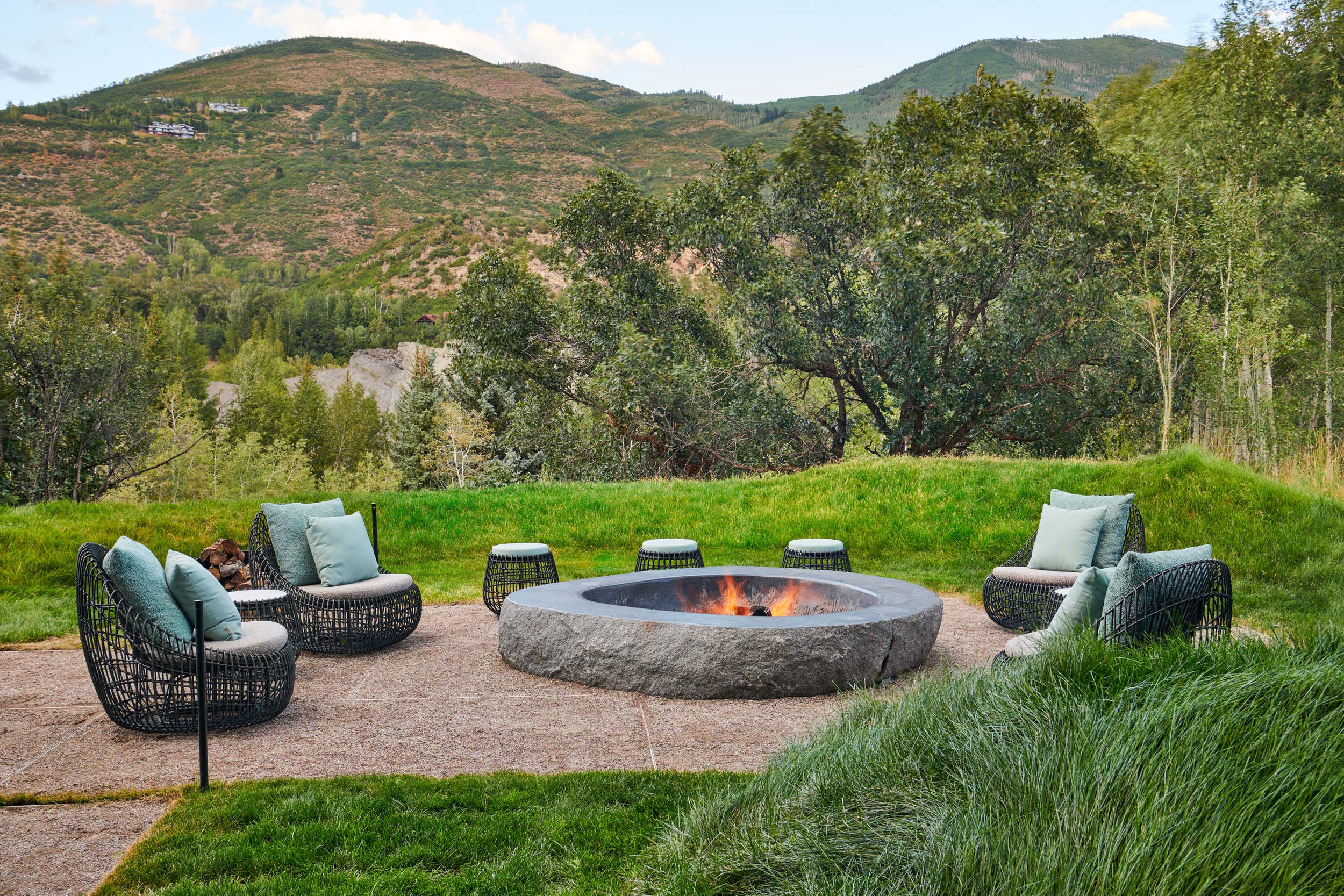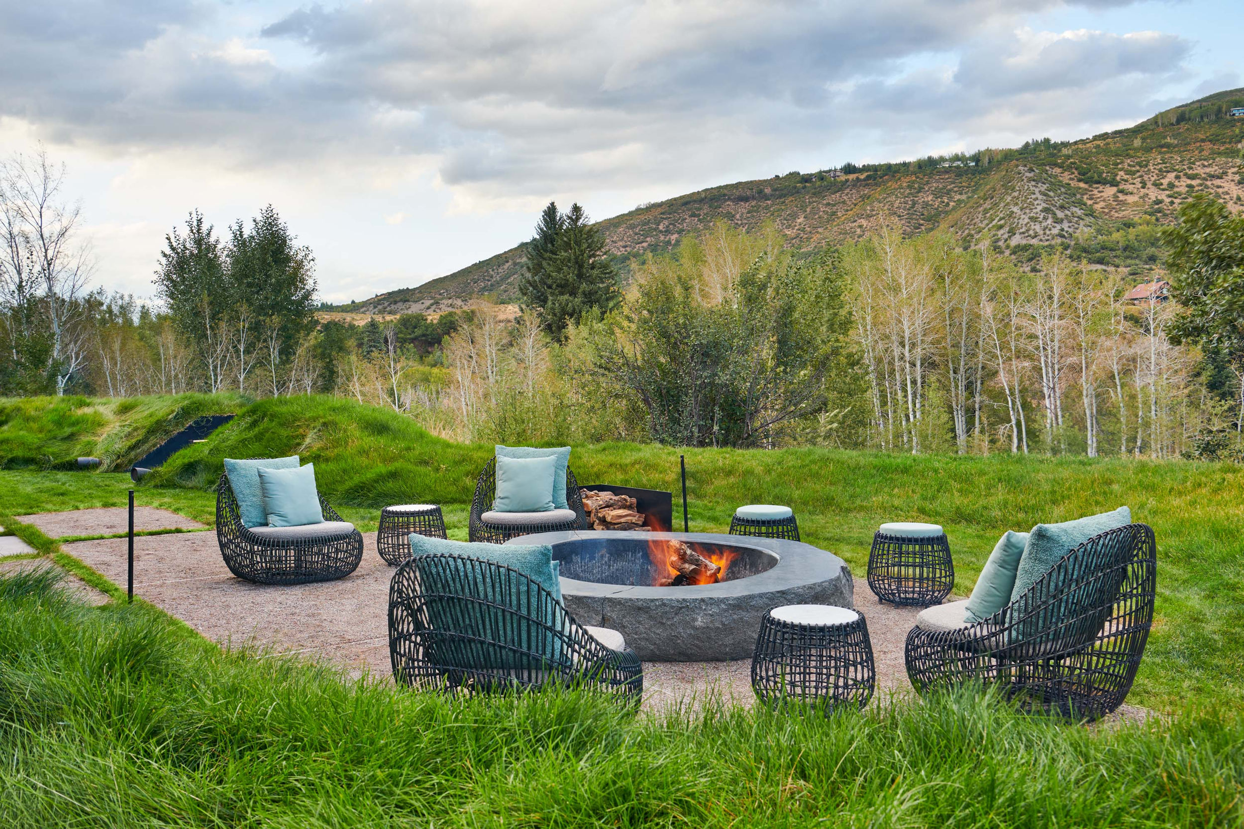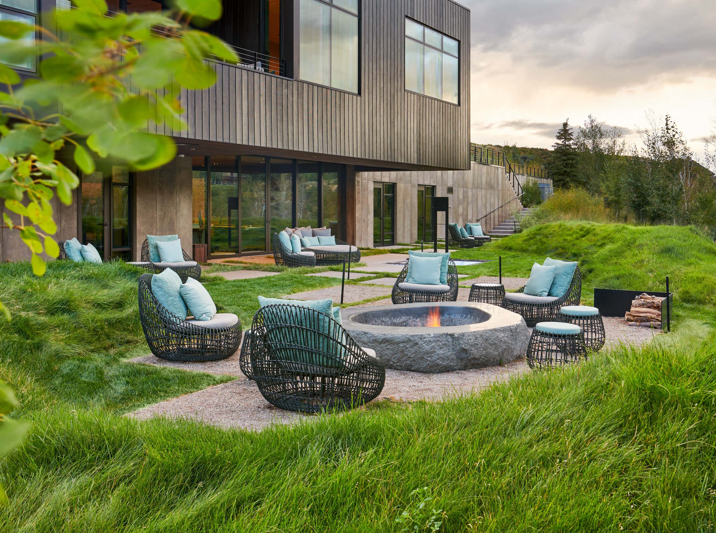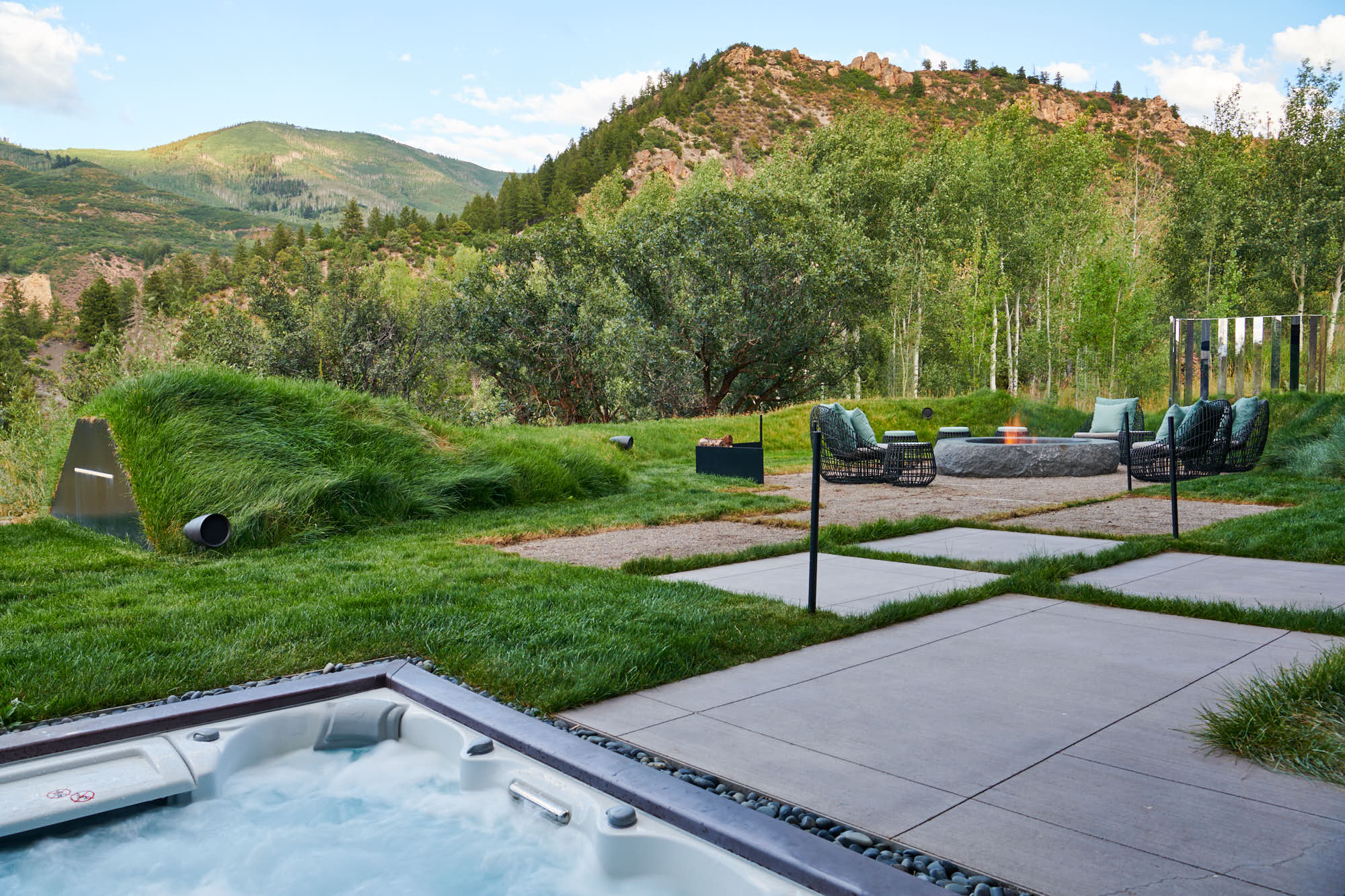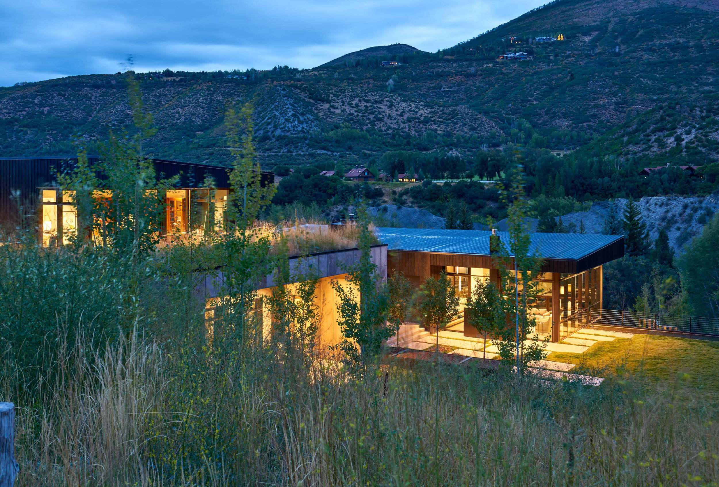 The surrounding meadow landscape was treated with the utmost respect on this 4.8-acre lot located in the highly desirable Double Bar X Ranch in Aspen. The house is designed to all but disappear into the landscape from the vantage point of any passers-by and is oriented towards the white noise of the Roaring Fork River. Connect One Design preserved privacy and achieved cohesion of land and structure through the use of an extensive vegetated roof system covering half of the project’s roofs. As the Client is an avid art collector, the landscape design was intended to both stage sculpture and be sculptural in itself. To achieve this design goal, storm water facilities were deliberately sculpted as functional land art in lieu of simple depressions, and a ‘worm berm’ was created to provide a meandering linear dance between what is man-made and what is natural. Additionally, a reflecting pool and water cascades were incorporated adjacent to the outdoor stairs to enhance the natural tranquility of the property and add a reflective dynamic.