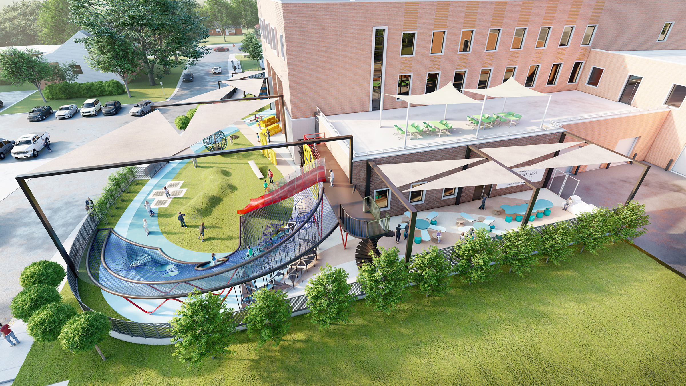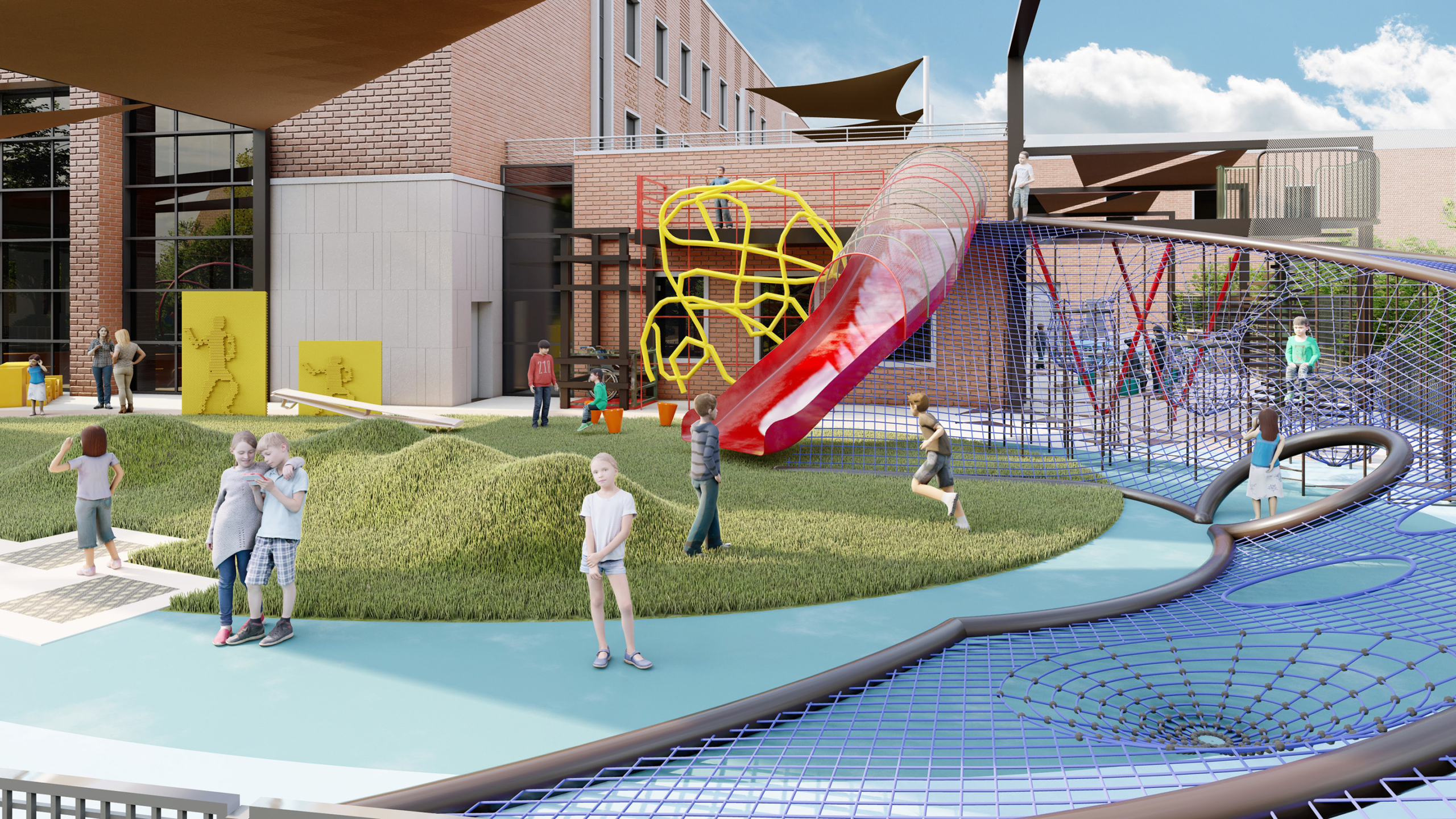 Connect One and museum staff chose the theme “cause and effect” to guide the design and Connect One worked to incorporate sensory play, open-ended play, musical play, and experimentation with motion into the play features, which included a large net climber, human-powered lift, vacuum tube, chime forest, sensory rollers, a roller table, kid-activated misting feature, spinning climber, seesaw, in-ground trampoline, and berm slide. JVA provided civil engineering services to integrate construction expertise and knowledge into the design phase of the project.