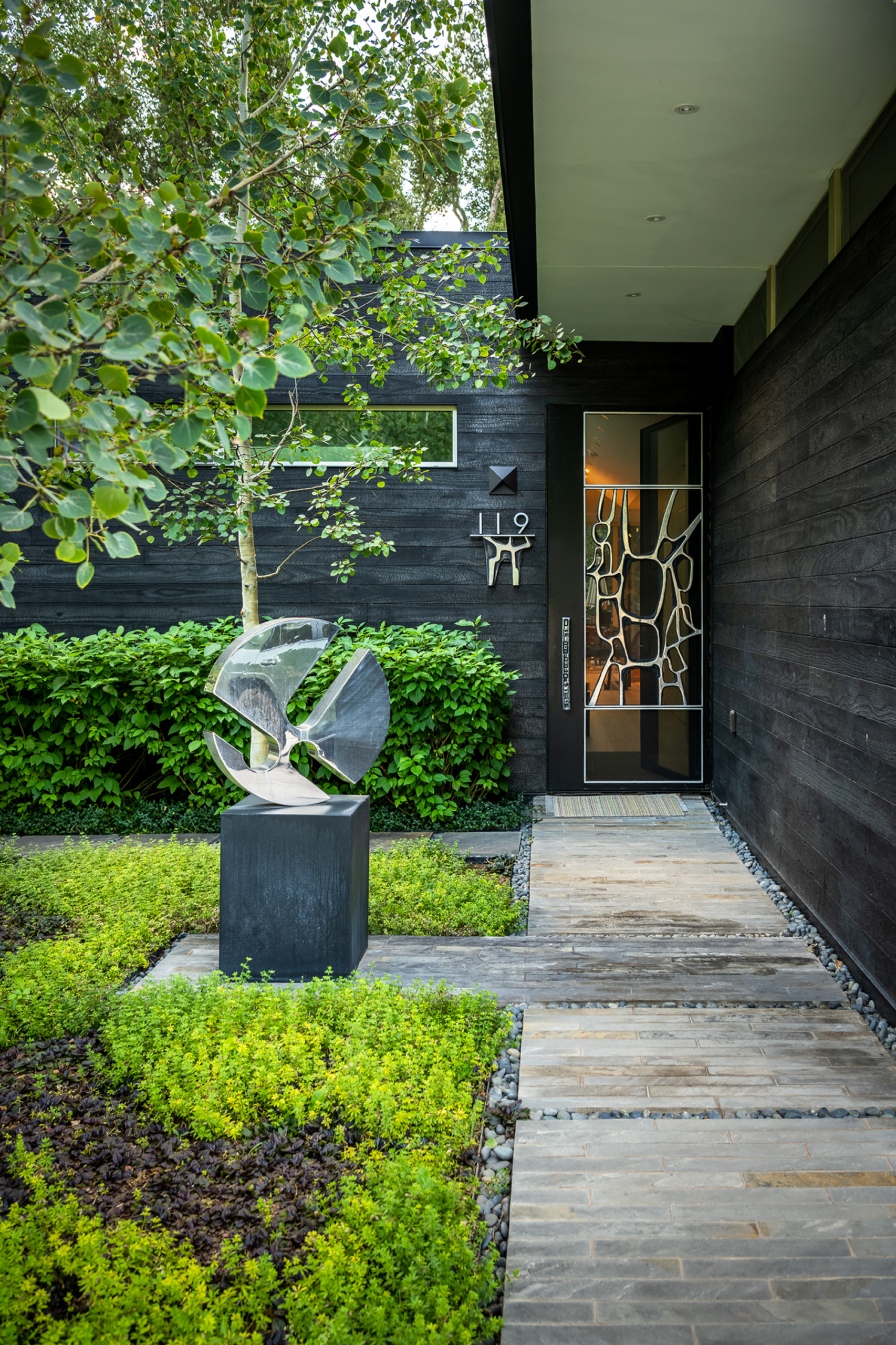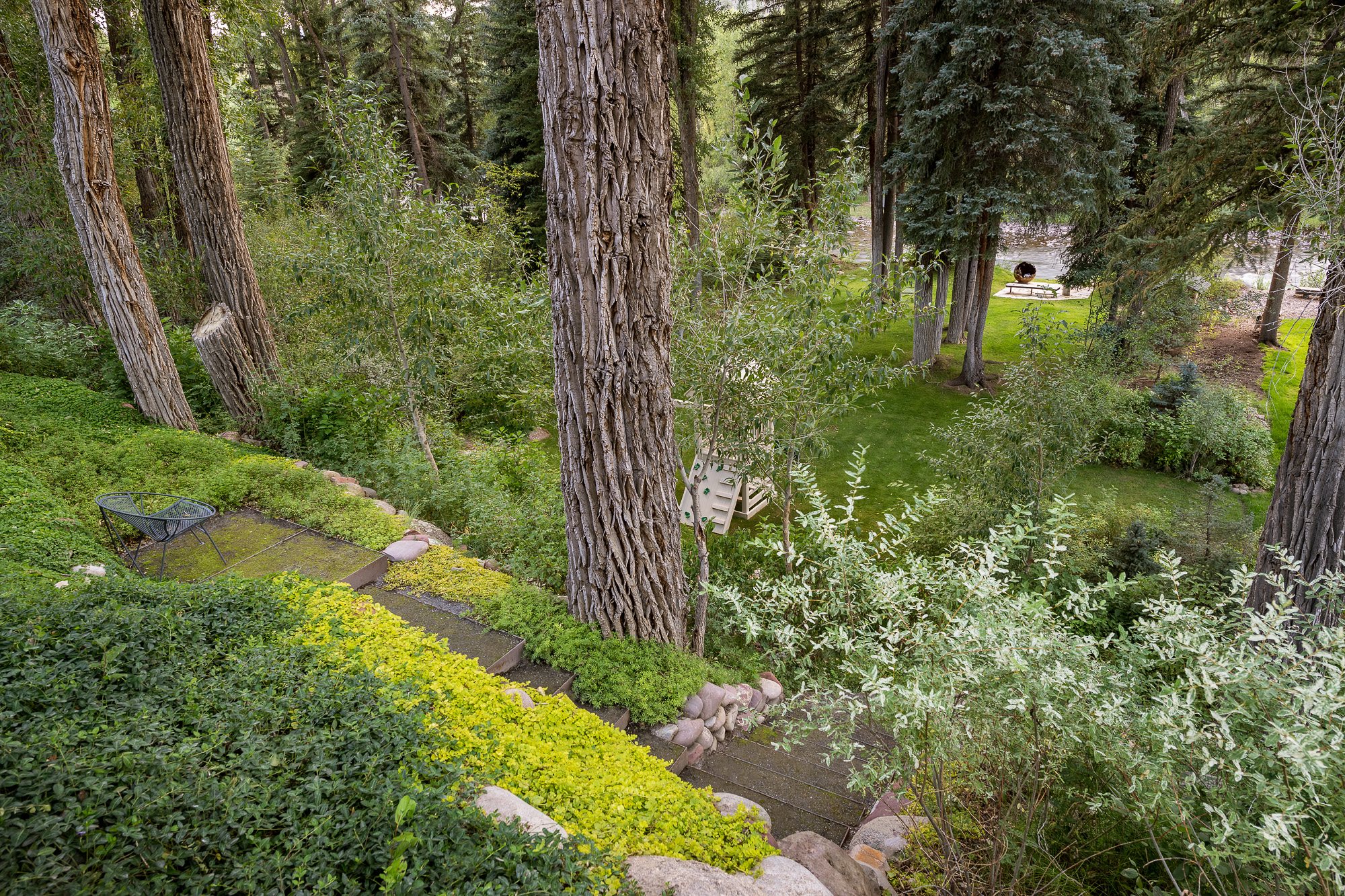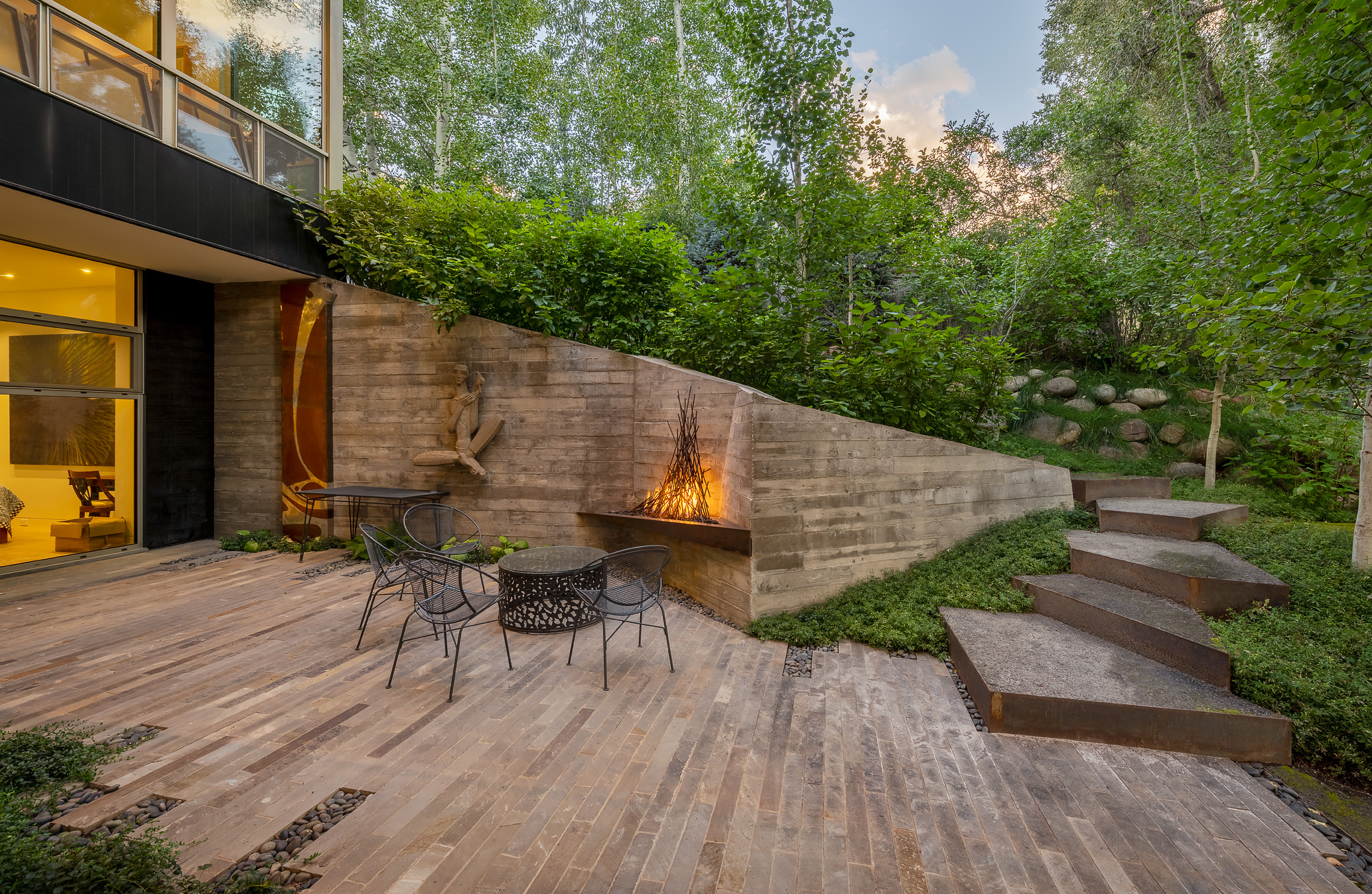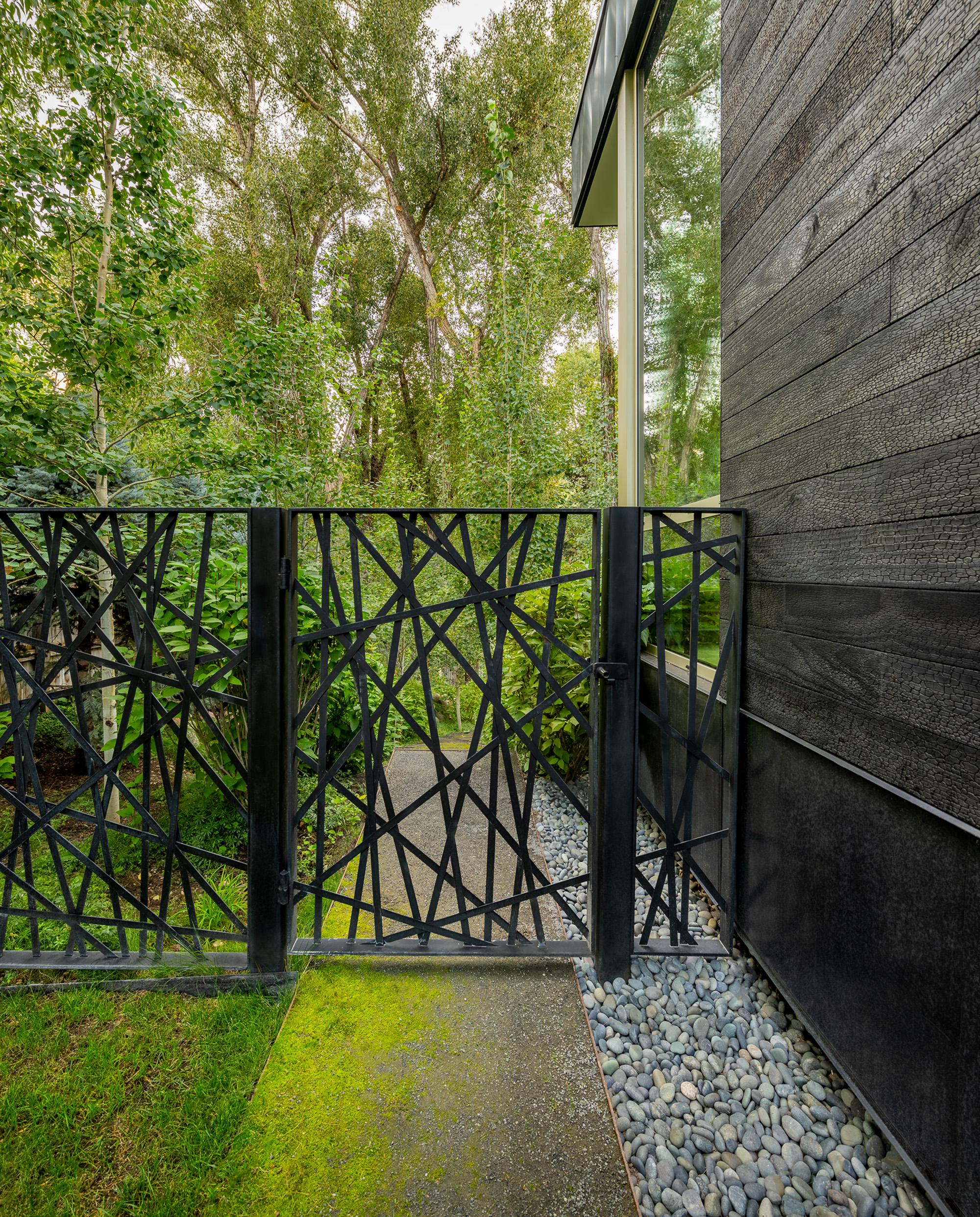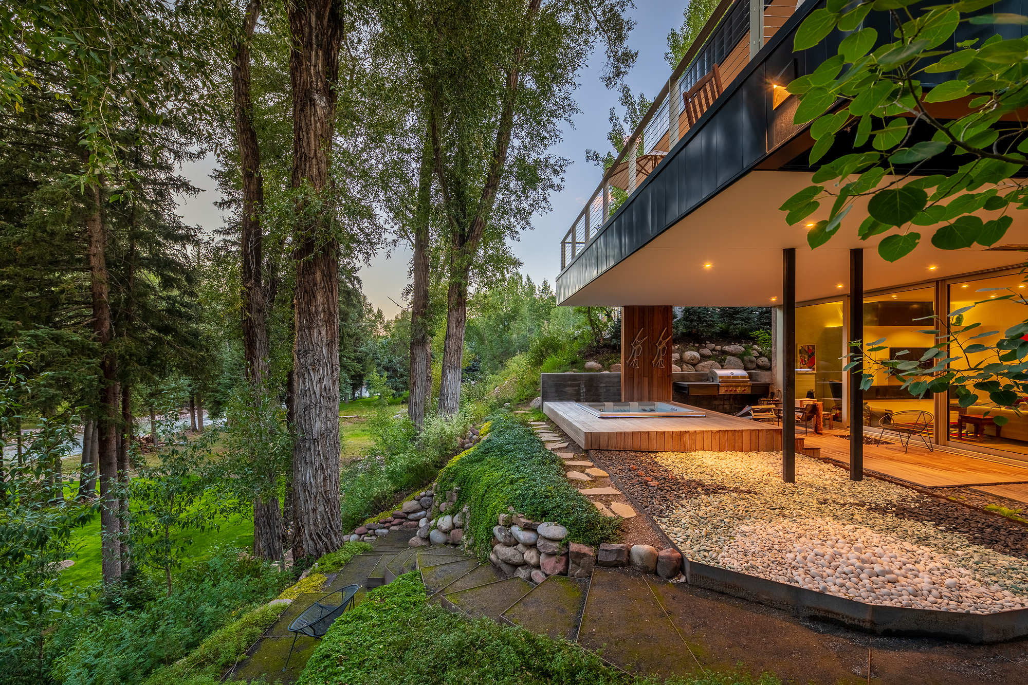 Distinctive features, such as a strategically integrated fire element and thoughtfully selected plantings, showcase Connect One Design’s commitment to merging functionality with artistry. Organic terraces with eroded edges, an observation landing, and moss-covered crusher fines surfaces enhance the riparian ambiance. Connect One’s meticulous attention to detail extends to custom elements like a foliage-inspired fence, a raised vegetable garden, and a pebble installation next to the spa echoing the property’s unique artistic spirit. The resulting landscape effortlessly harmonizes with the residence, offering an immersive experience that feels boundlessly connected to nature.