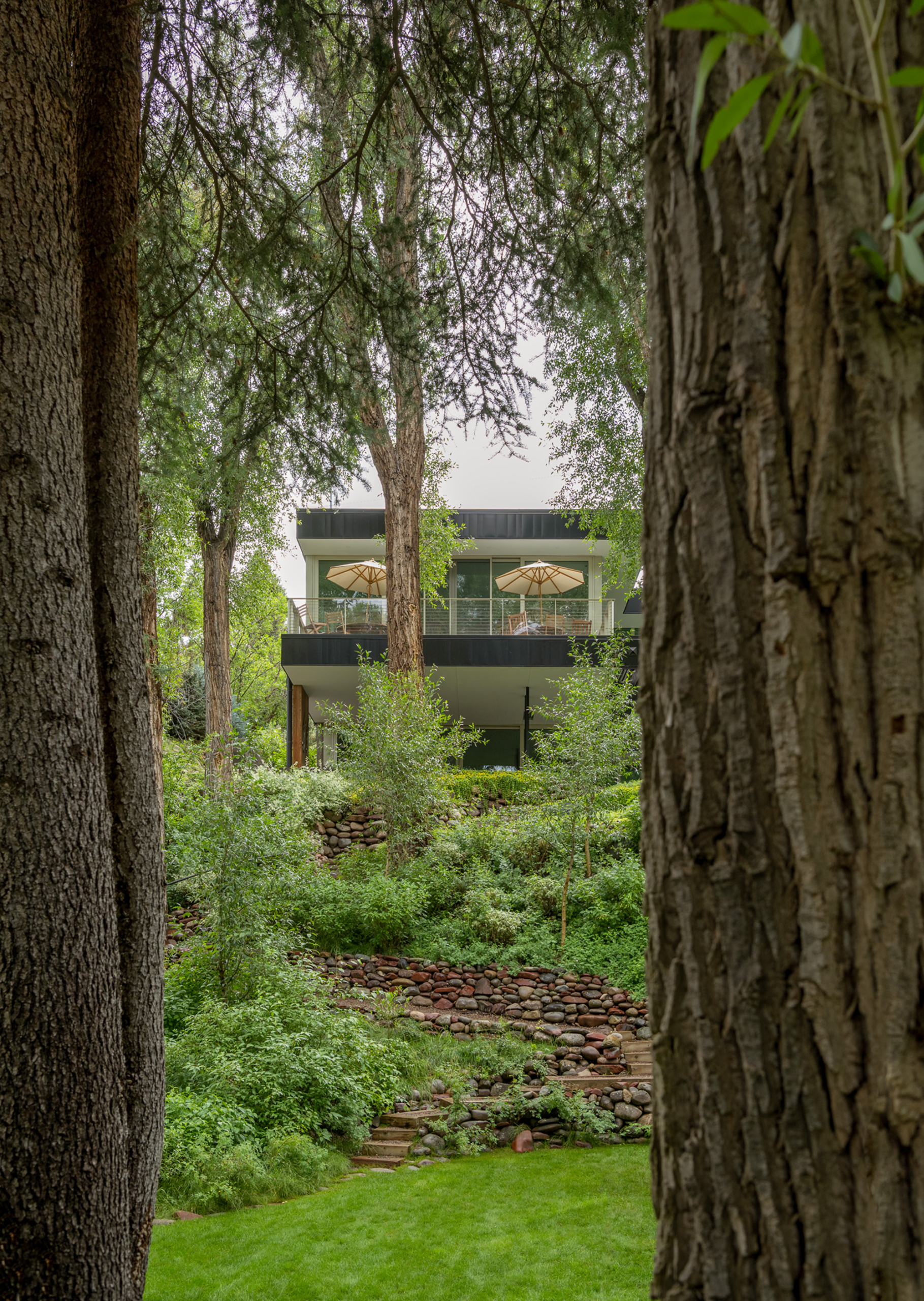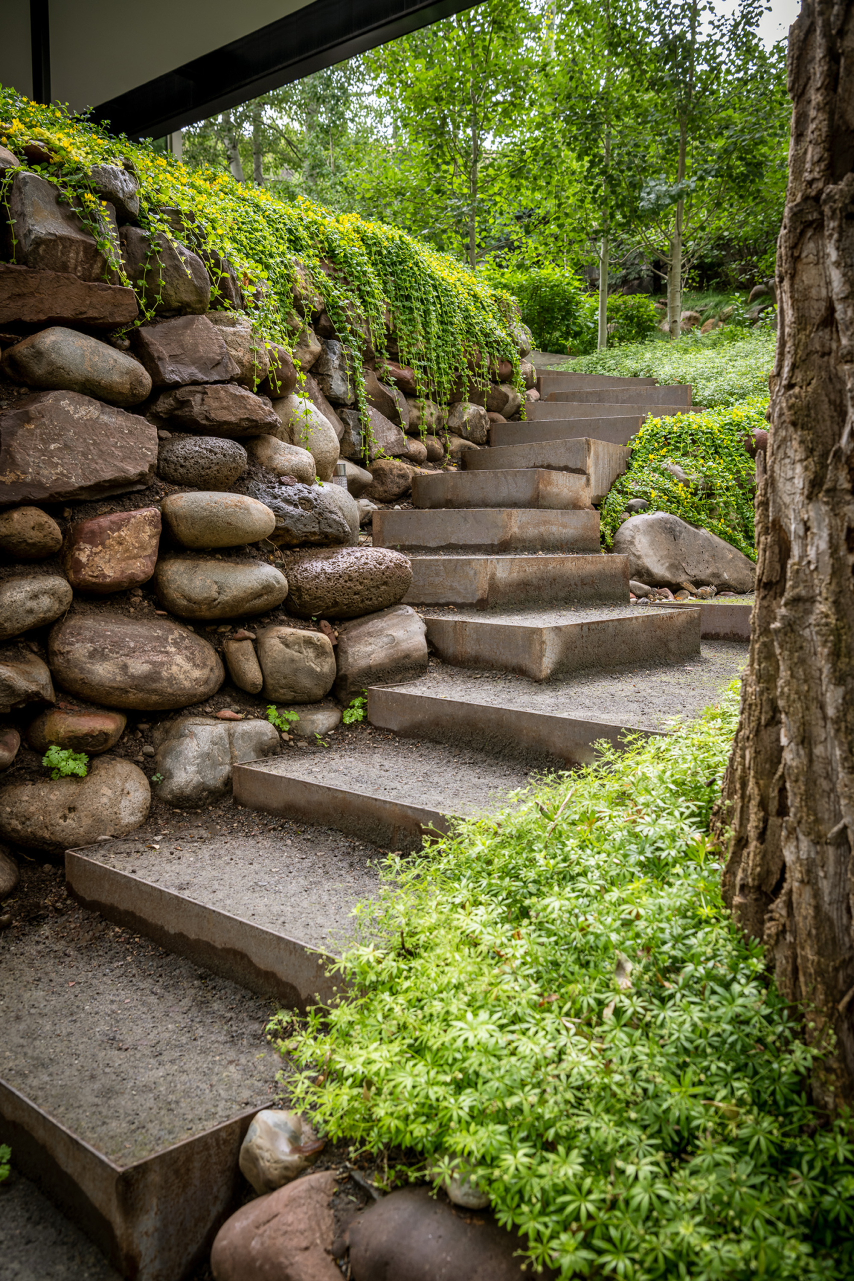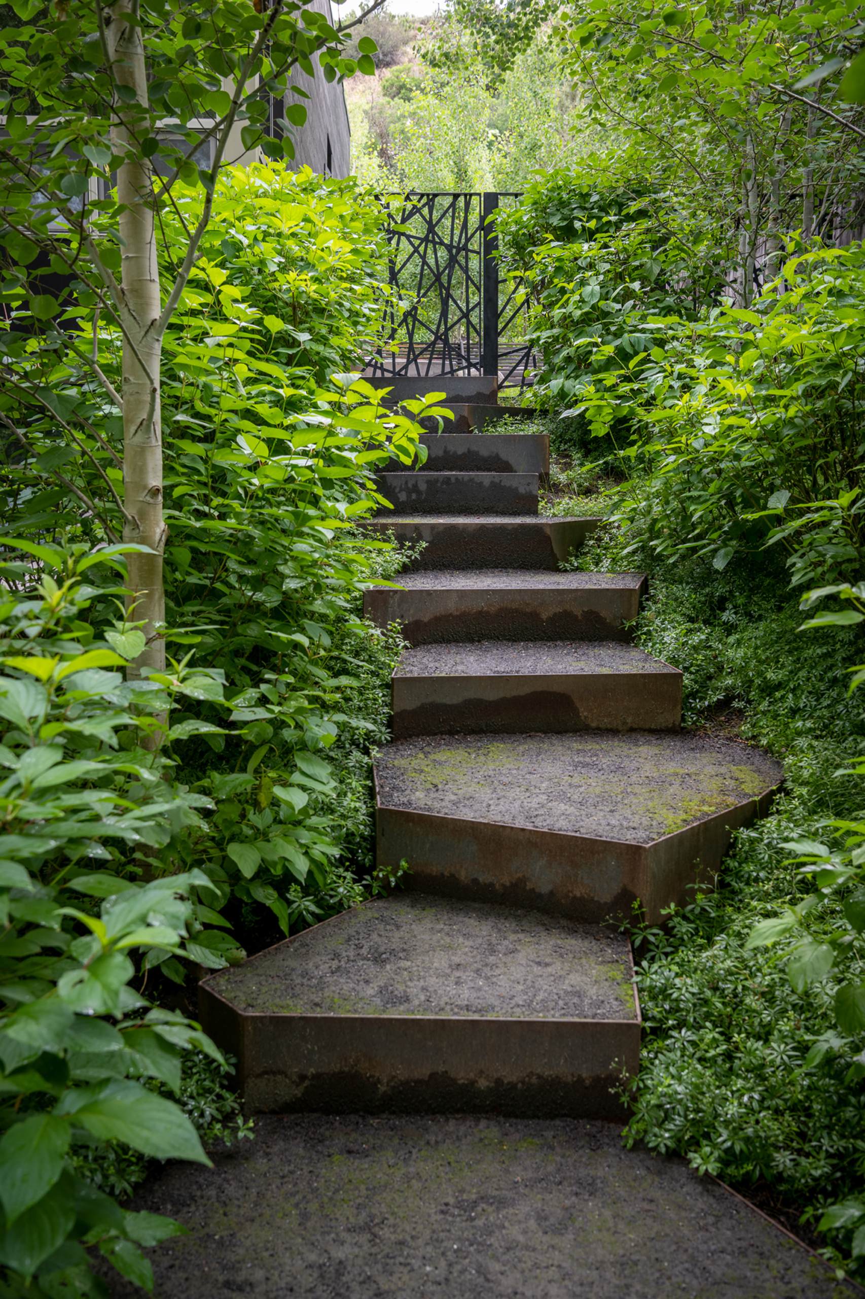 The transformative landscape architecture gracefully balanced code requirements with aesthetic aspirations, resulting in rewilded riparian clearings around the house. By creatively repositioning a deep dry well and introducing a bi-directional retaining wall, Connect One departed from conventional geometric forms, embracing angled structures exemplified in the landscape steps. Crafted off-site from mild steel, these steps harmoniously complement the challenging terrain.