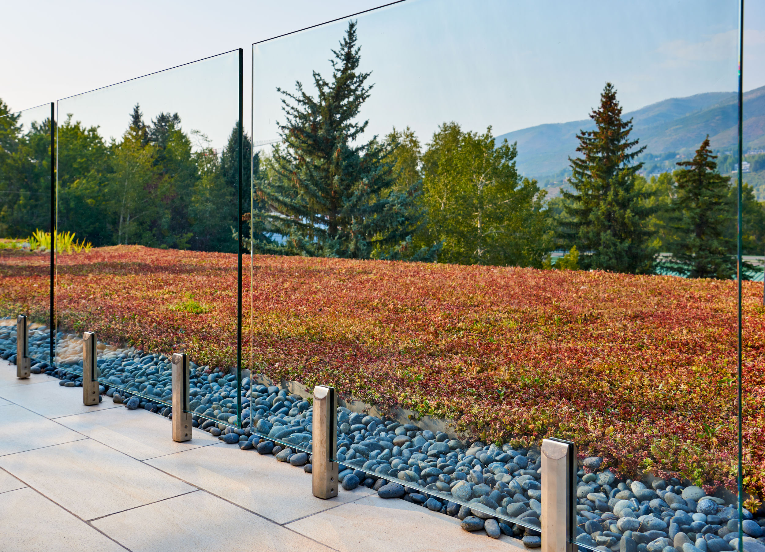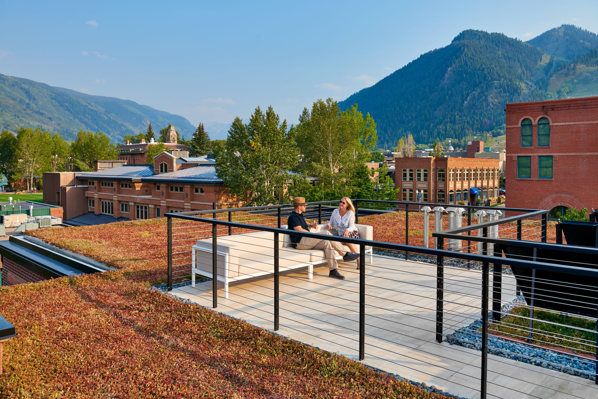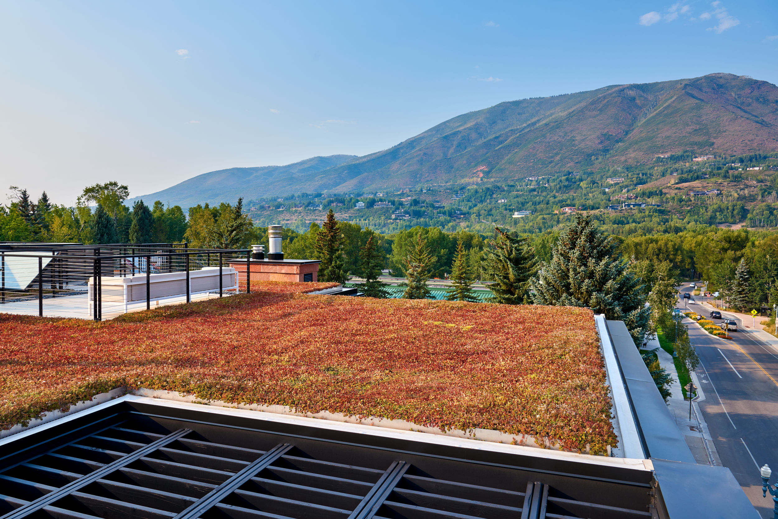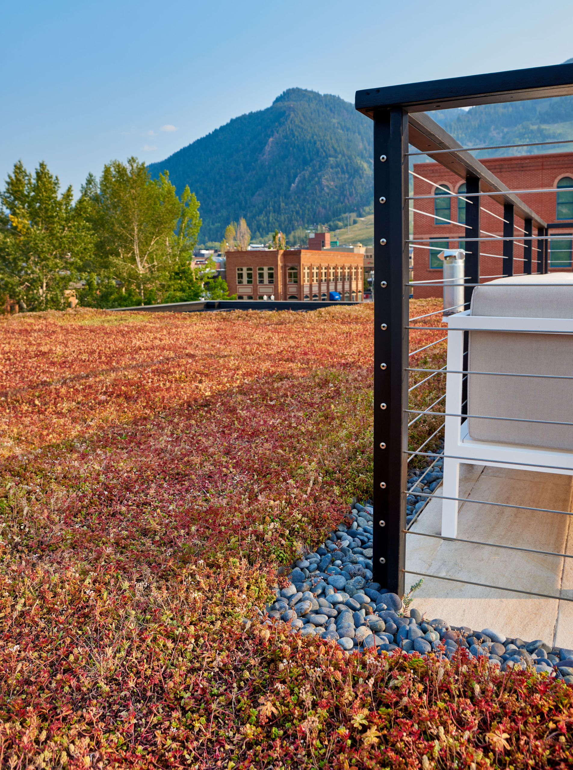 These four luxury penthouses north of the Hotel Jerome were designed by David Johnston Architects. Upon completion in 2016, the roof deck was the largest vegetated roof in Aspen, coming in at 3,100-square feet. Connect One Design carefully chose a variety of sedum to create a colorful, durable perimeter to the activated roof space. The vegetated roof also helps the building owner maintain stormwater quality and control water runoff.