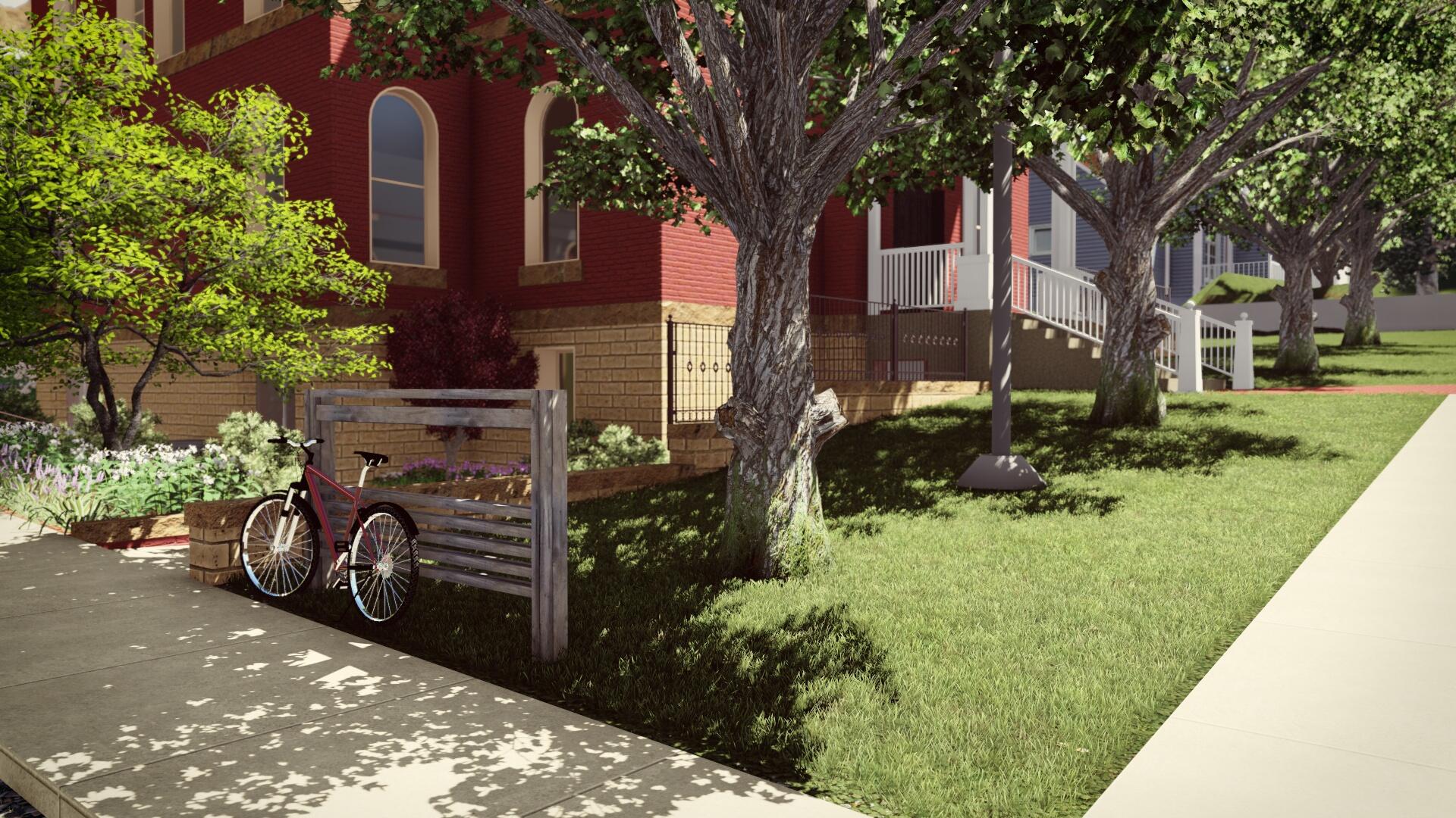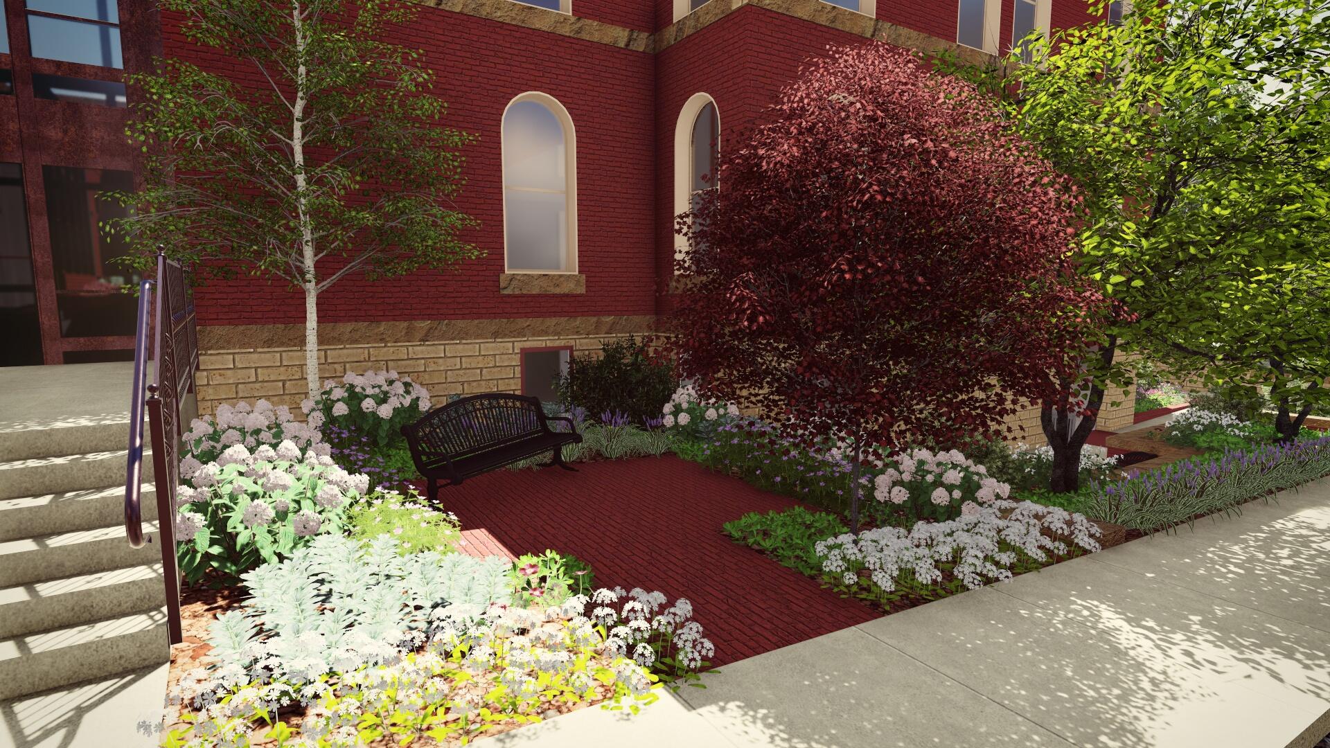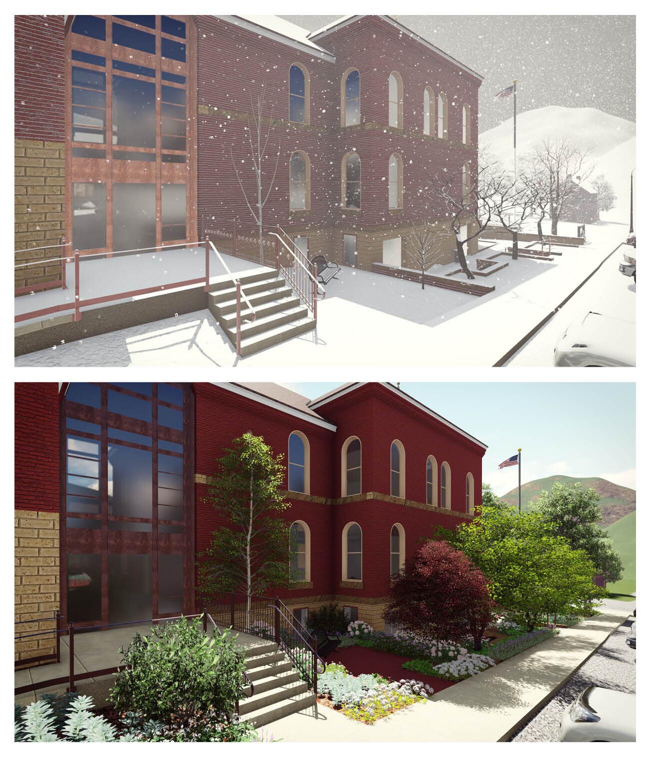 Demolition and restoration work proved to be exciting, as the basement of the courthouse was unearthed, after long ago being filled and capped, to reveal stonework and barred windows. A long search ensued for the original courthouse’s cornerstone. A USGS marker was removed and gifted to the Courthouse to be displayed inside. The final implemented design included such historical detail as the four stately sugar maples at the front façade, a front and side lawn, a wrought-iron railing design, a bike rack “hitching post”, and hitching post parking signage.