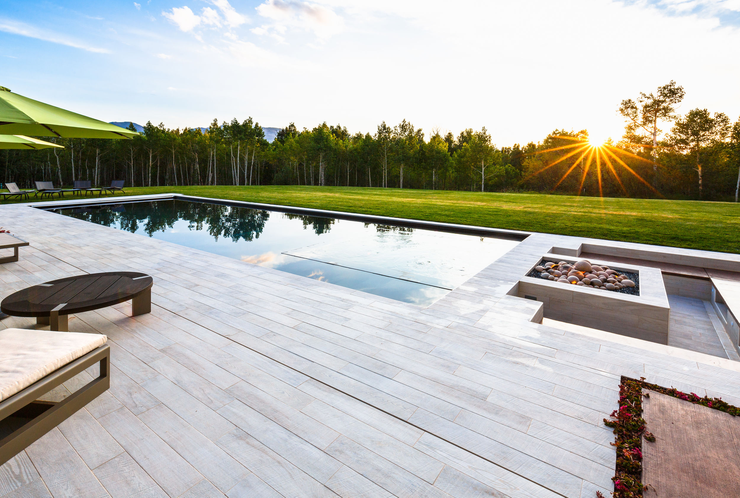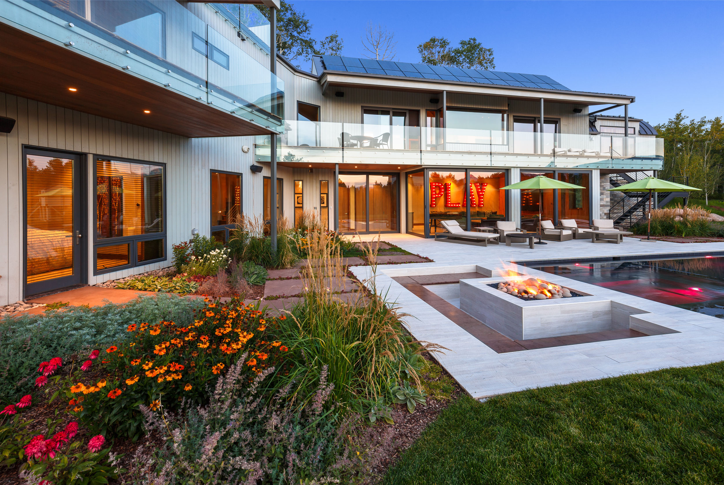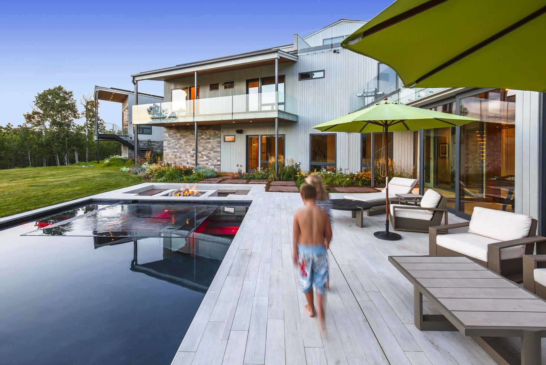 Clean edges and a minimalist aesthetic in the constructed landscape help to emphasize the wild beauty of the surrounding natural vegetation. A large lawn creates a striking foreground to the aspen grove and also provides an expansive play area for the client’s children. The design gracefully accommodates all the amenities a young, active family will enjoy, including a pool and spa, basketball court, lawn games, and a tree fort.