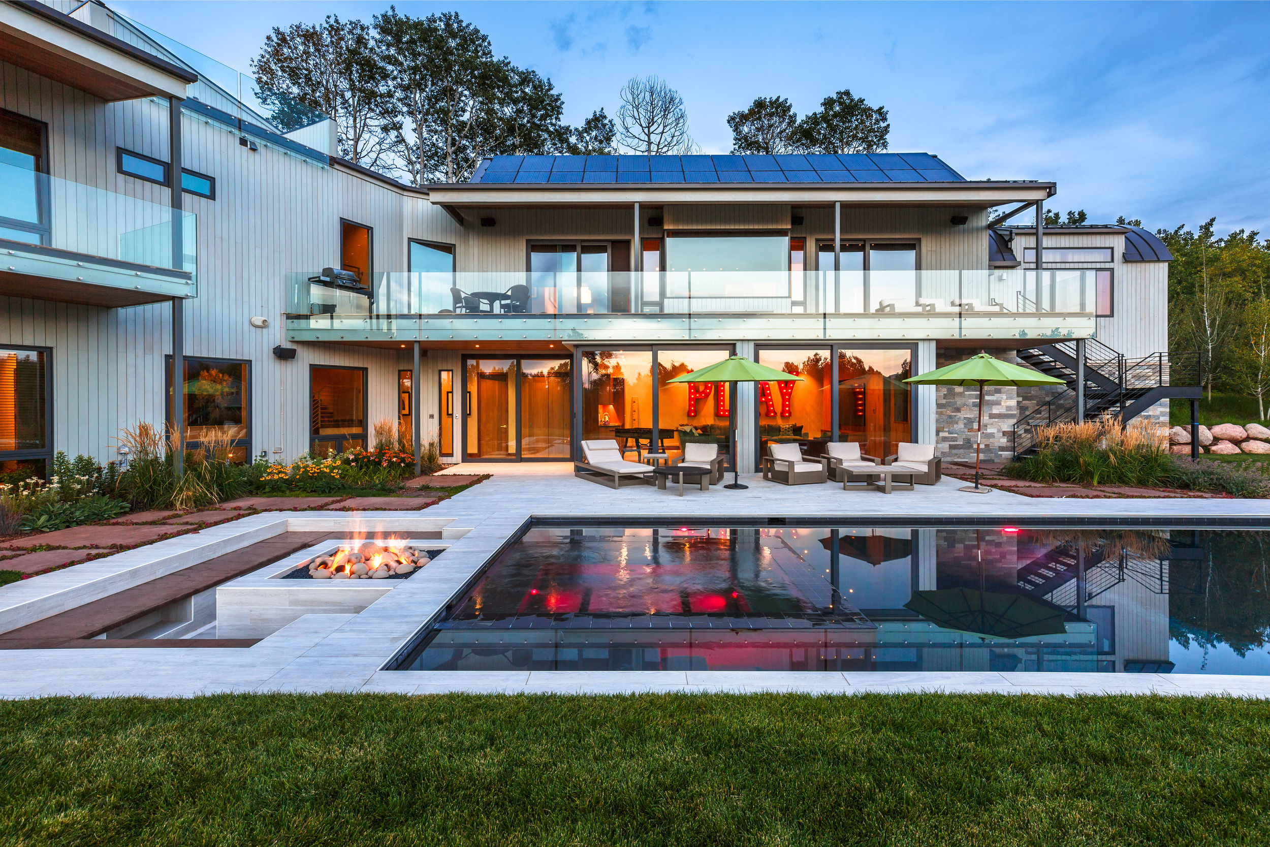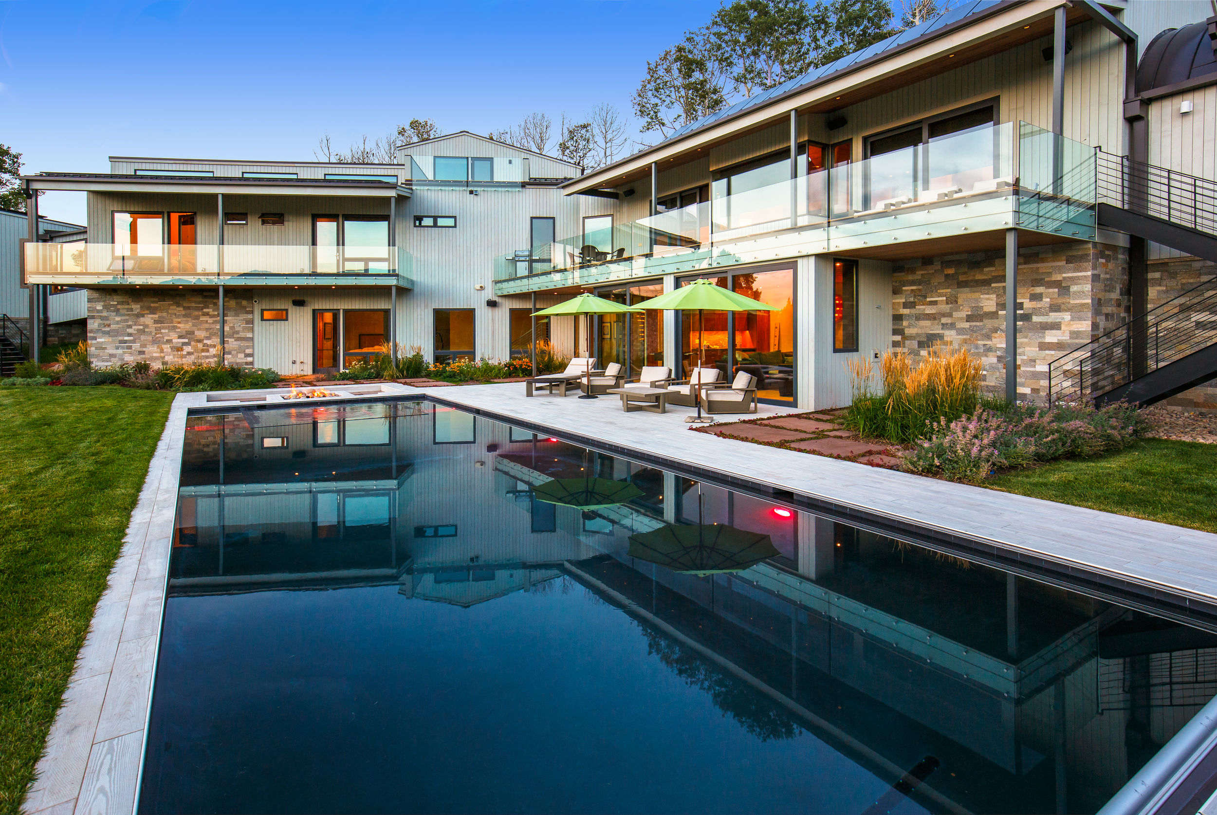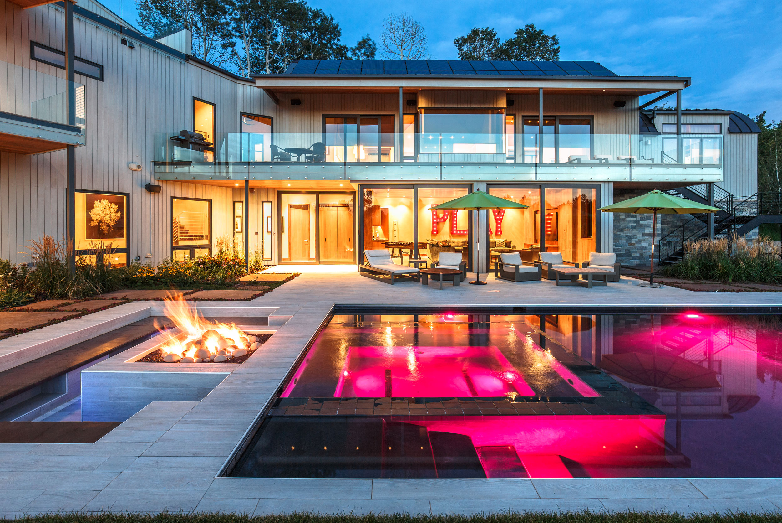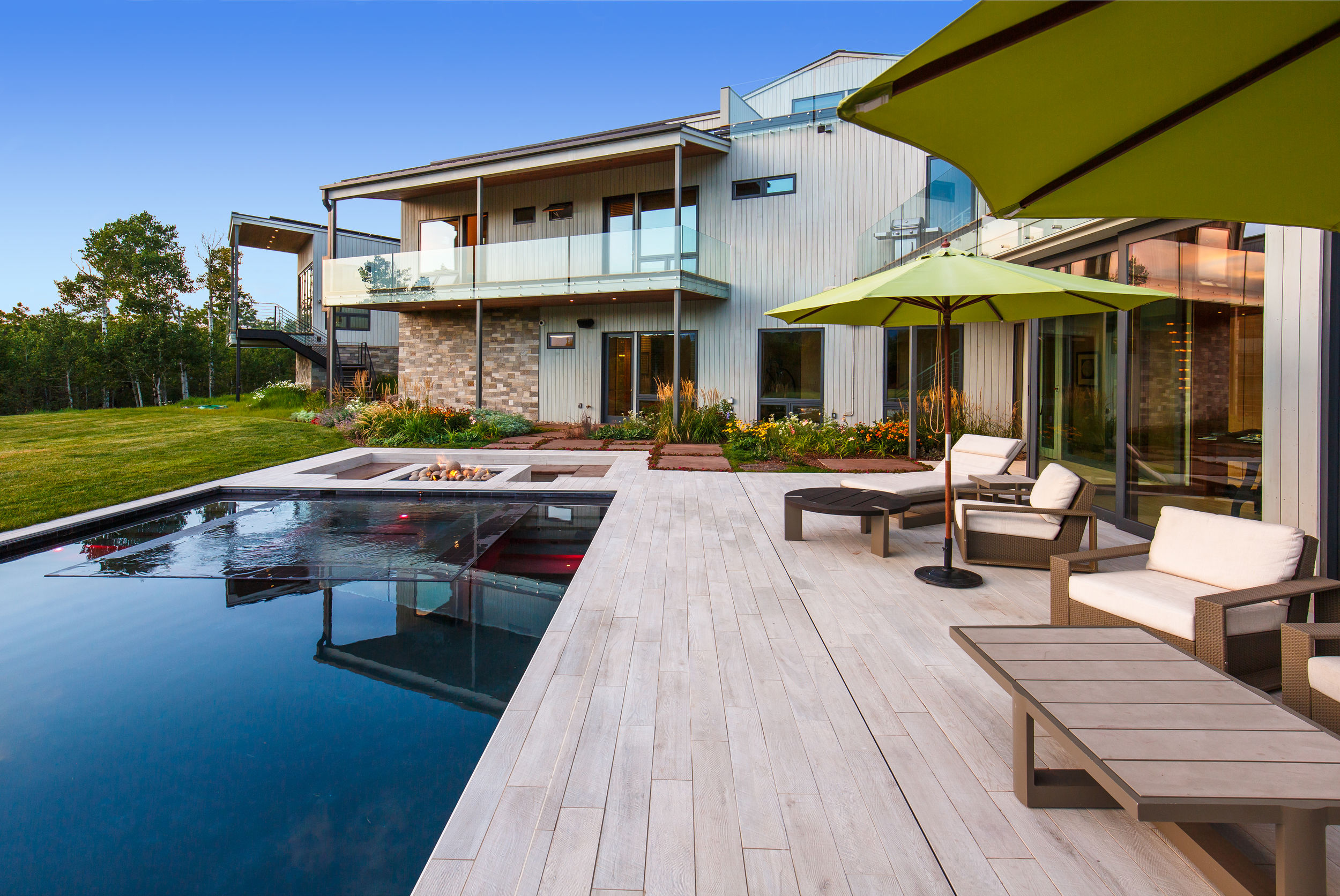 Clean edges and a minimalist aesthetic in the constructed landscape help to emphasize the wild beauty of the surrounding natural vegetation. A large lawn creates a striking foreground to the aspen grove and also provides an expansive play area for the client’s children. The design gracefully accommodates all the amenities a young, active family will enjoy, including a pool and spa, basketball court, lawn games, and a tree fort.